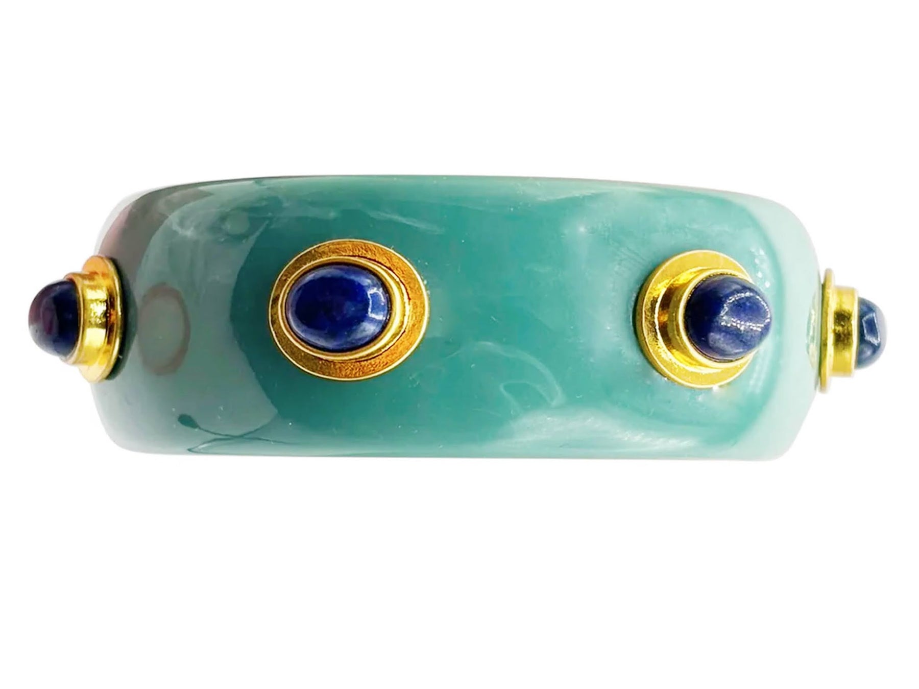 A bangle of rich turquoise resin with reconstituted bezel set lapis stones.