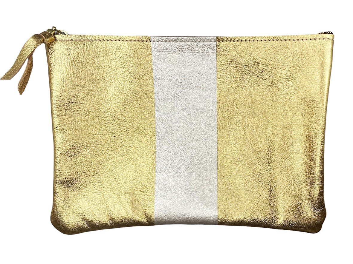 Large Gold Metallic Leather Everyday Pouch with Platinum Stripe