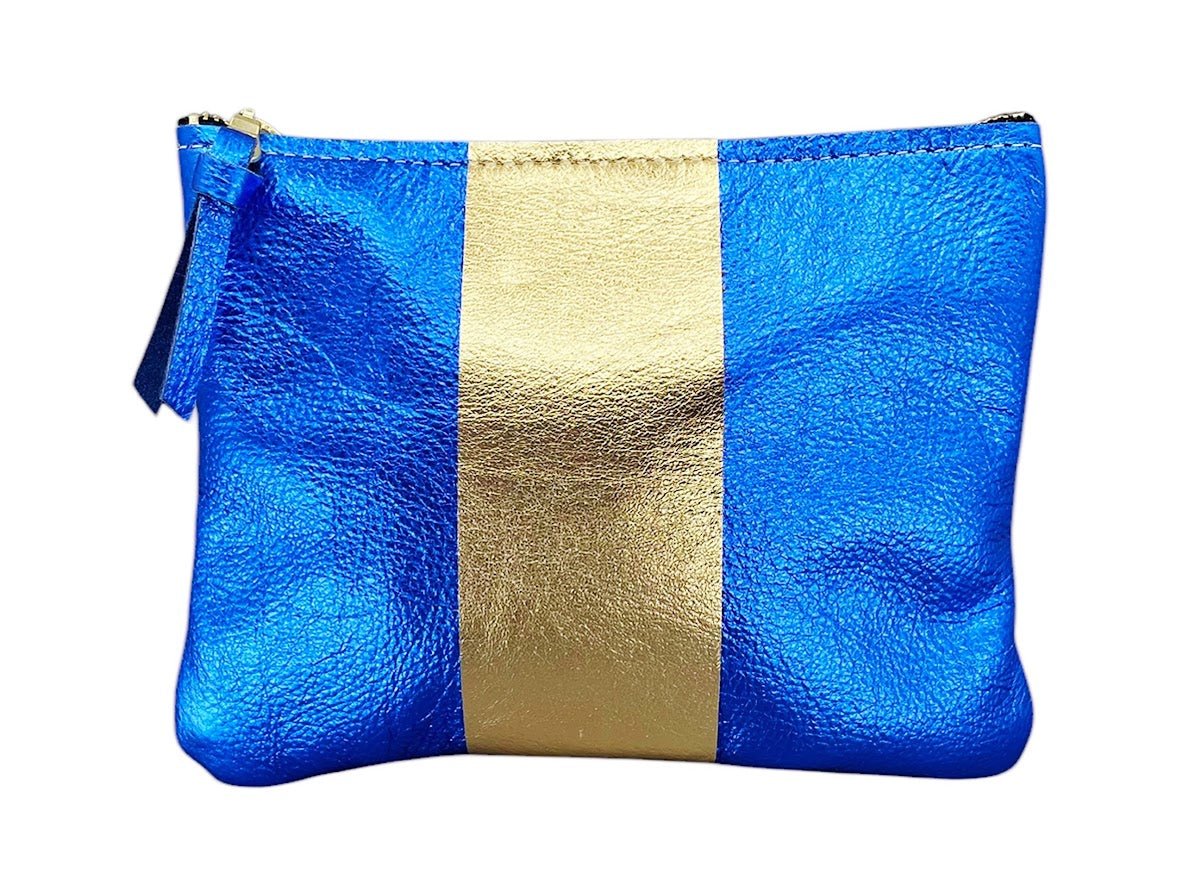 Made of soft metallic leather with a handcut stripe, this unlined pouch has a small leather zipper pull and measures 7 inches by 5.5 inches. Perfect for your everyday essentials. Made in the US.