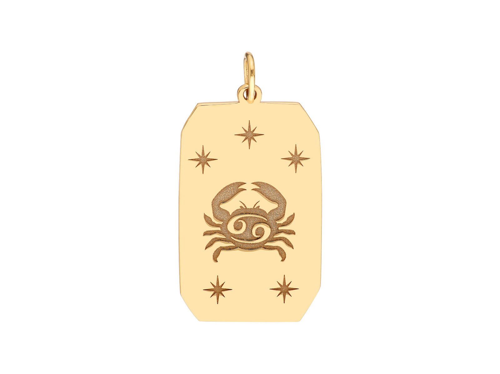 Made of 14k yellow gold, this 13mm by 20mm pendant is engraved with the zodiac sign for Cancer. Pair it with your chain of choice.