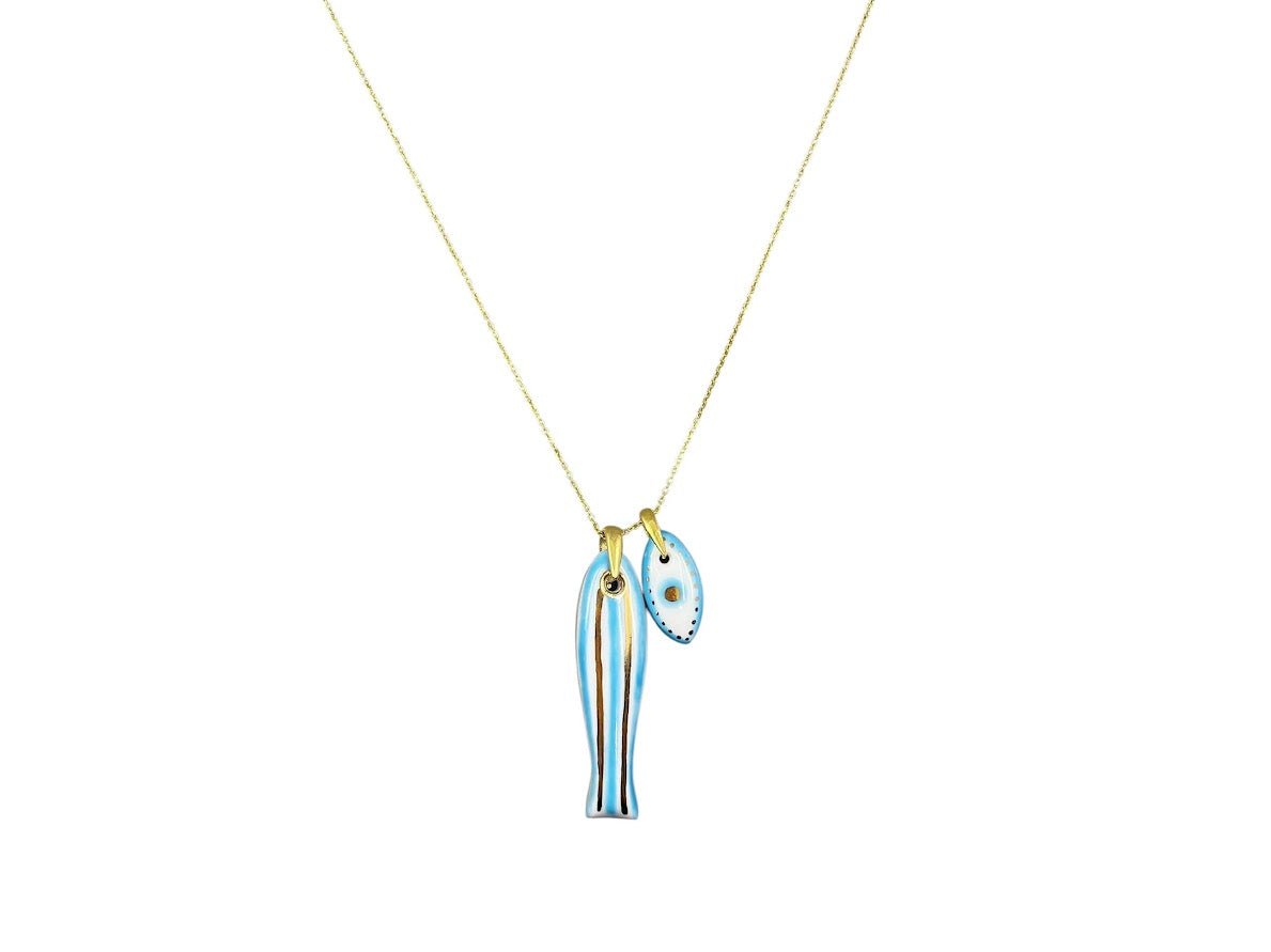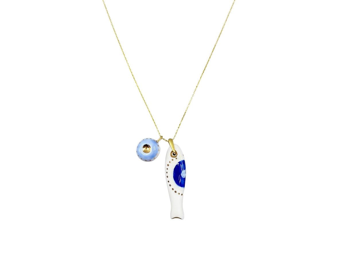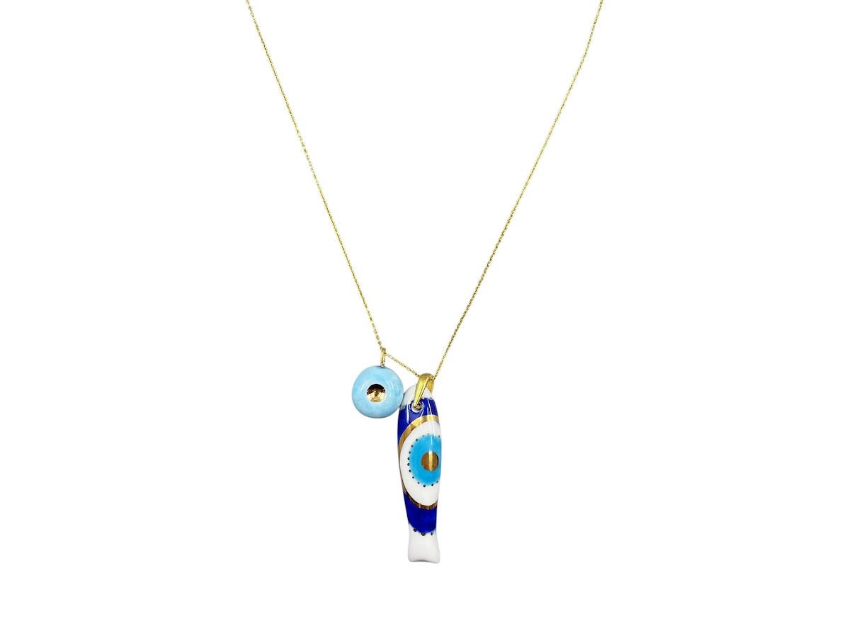 Handpainted Italian Porcelain Turquoise, Navy, and Gold Evil Eye Fish Charm