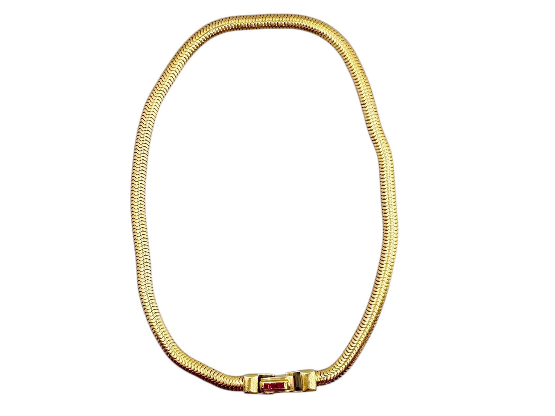 Made of 14k yellow gold, this estate snake necklace features a ruby clasp and measures 15 inches long. Fits a smaller neck.