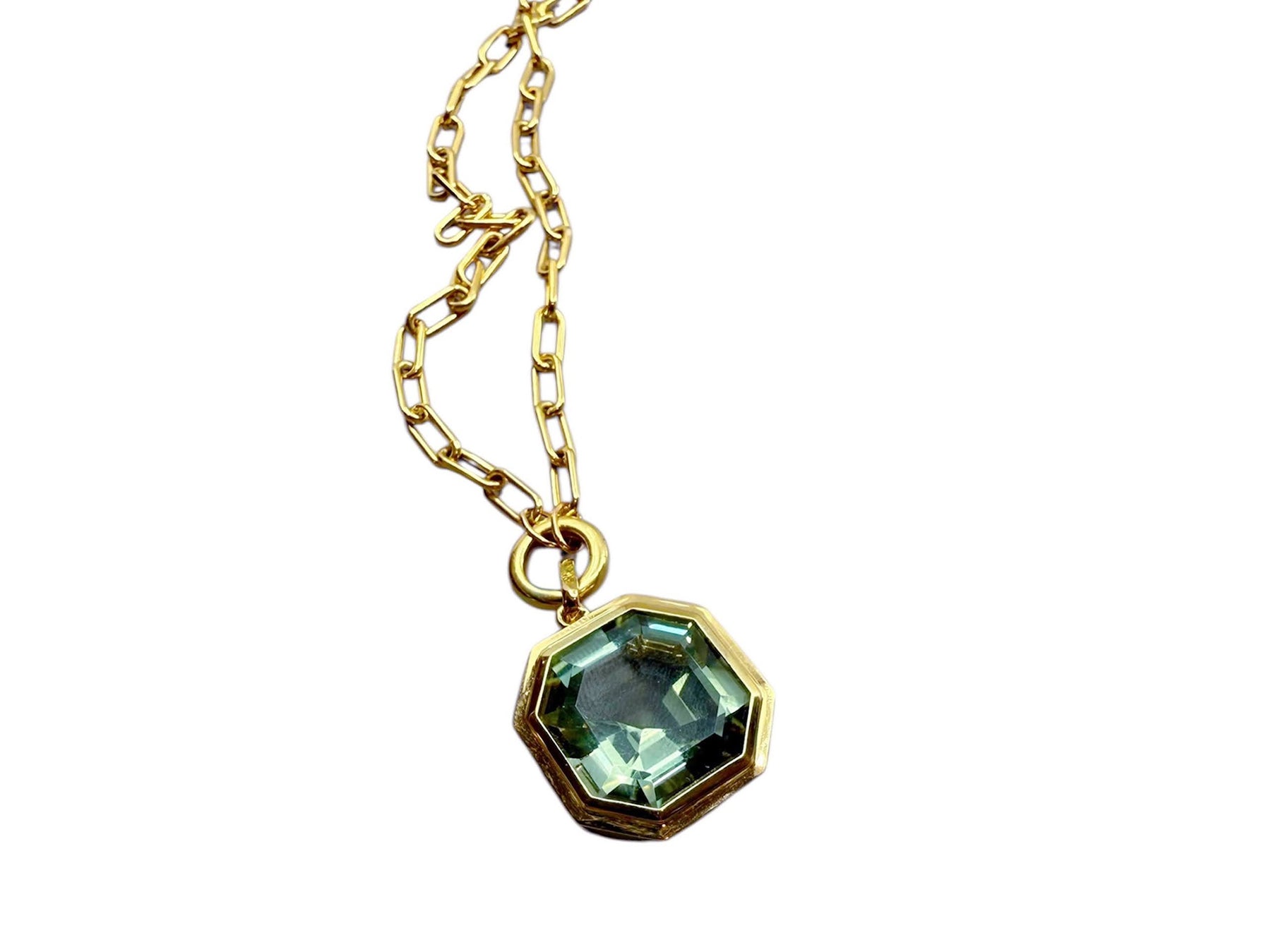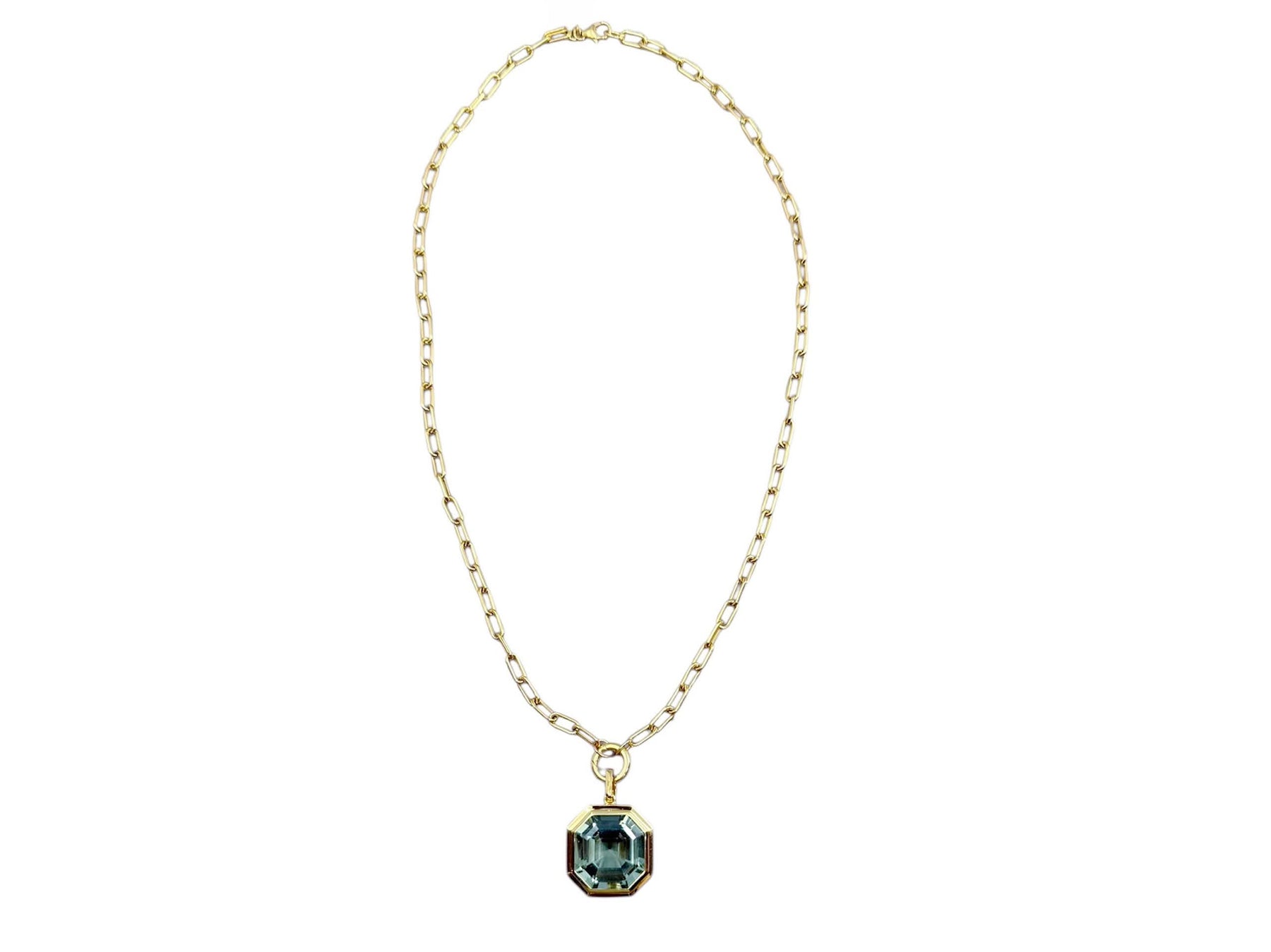Made of 18k yellow gold, an Asscher cut prasiolite stone that's approximately 15cts hangs from an 18k yellow gold chain.