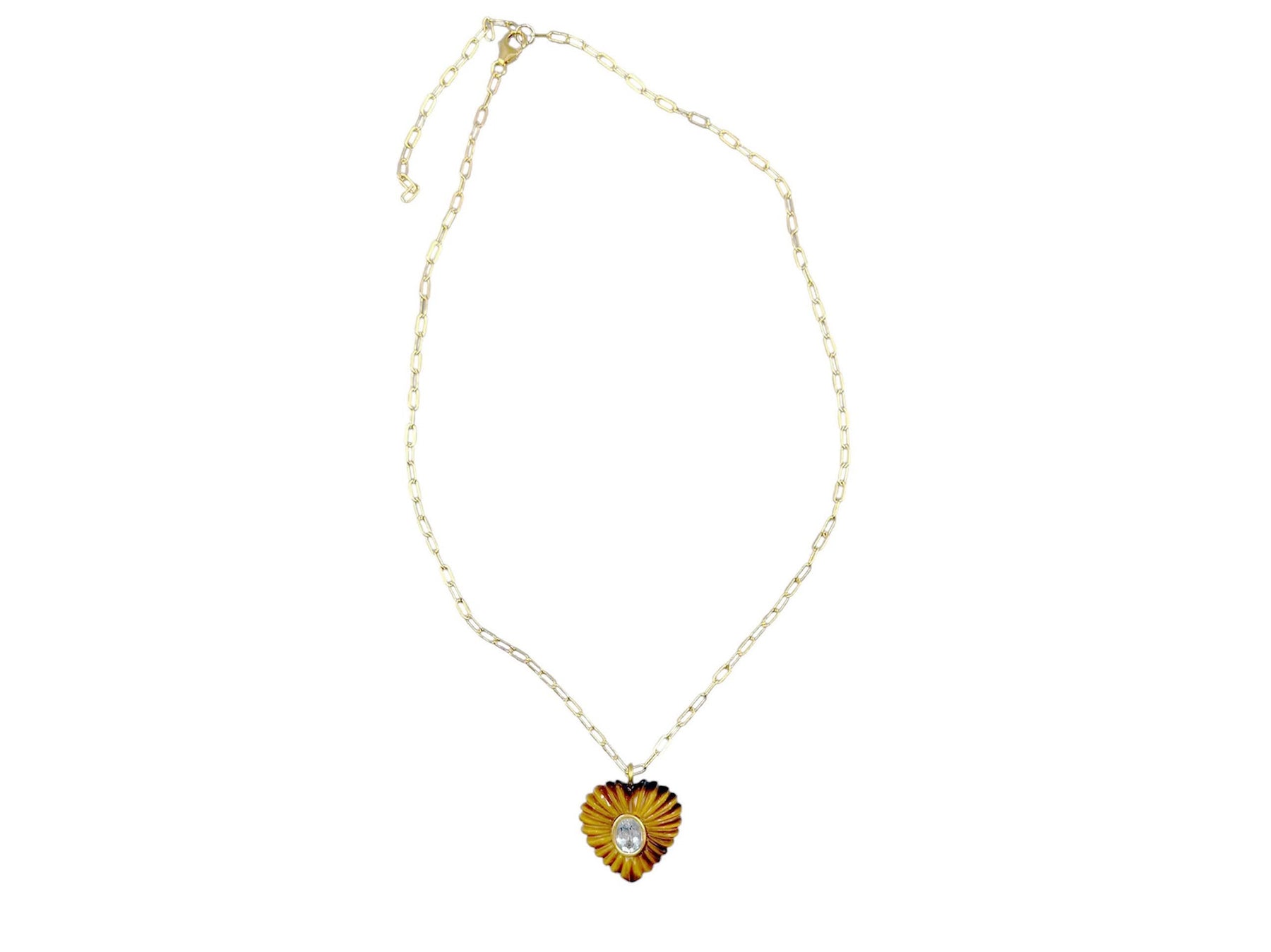 A hand-carved tiger eye and 18k gold vermeil charm, with a blue topaz center stone, dangles from an 14k gold vermeil necklace. Adjustable up to 21 inches long.
