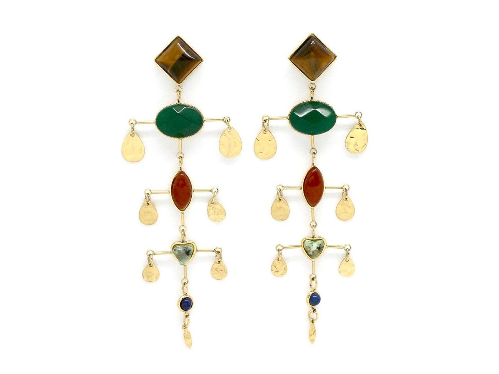 These 18k gold-plated huggie hoops, detailed with beading, feature 7mm by 11mm evil eye charms with 2mm white topaz center stones. Hoop closure is 18k gold vermeil. Hoop diameter is 14mm.