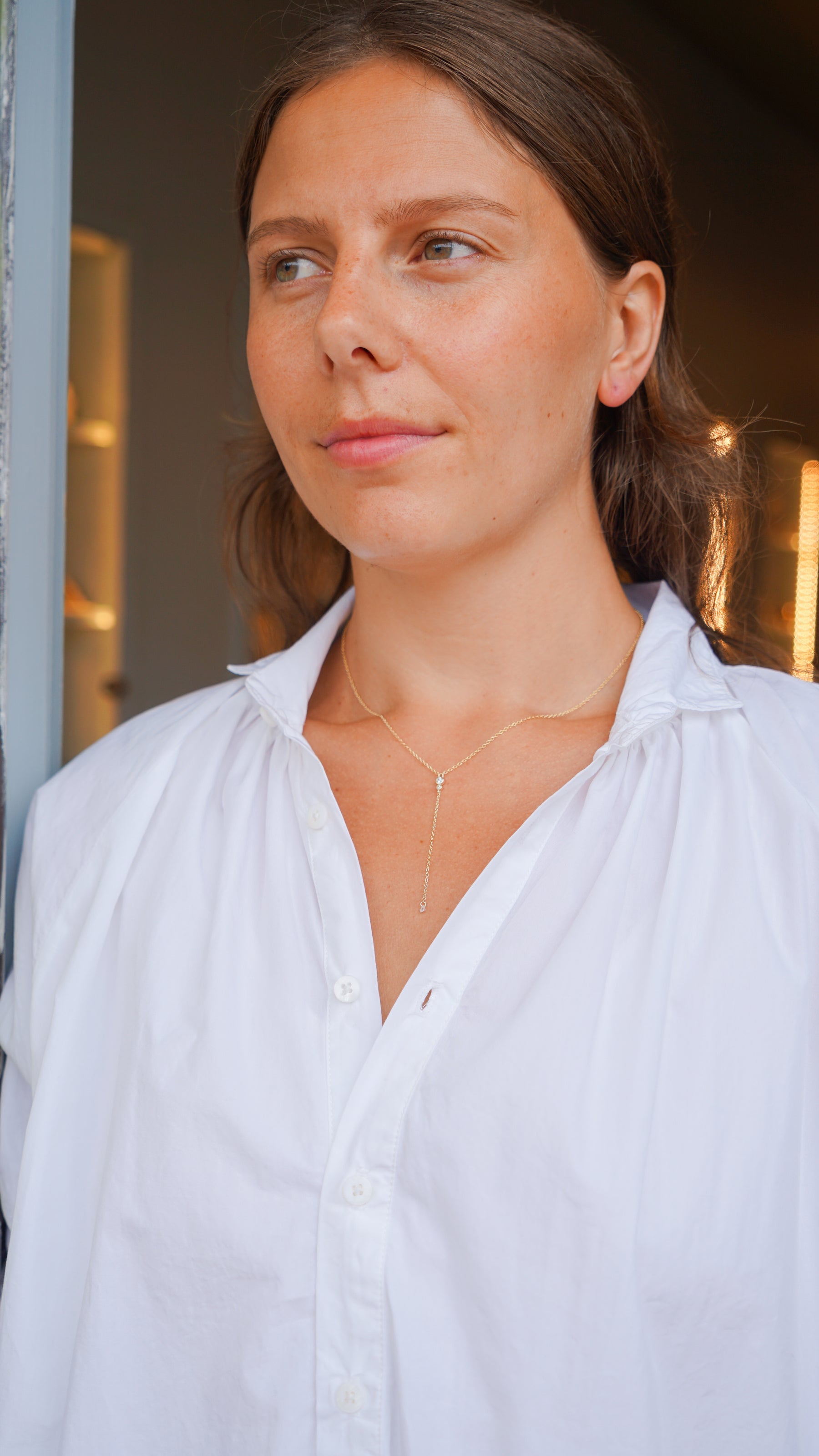 A sleek chain, made of 14k gold vermeil, features a cluster of cubic zirconia at the center plus a single cubic zirconia at the end. Chain is adjustable from 16 to 18 inches. Lariat drop is 2.5 inches. Center cluster is 6mm in height. Drop stone is 3mm. Nickel free and hypoallergenic.