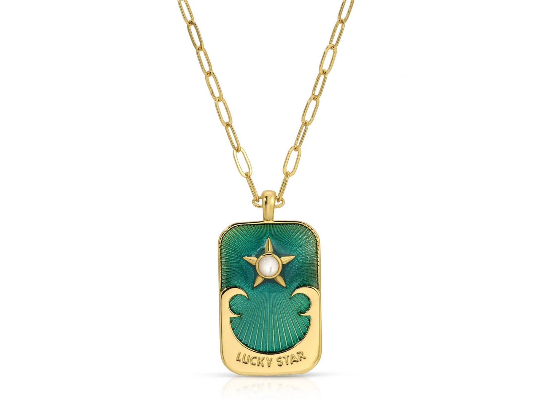 Inspired by Victorian era good luck talismans, this necklace features a green enamel charm with a mother of pearl star and the words LUCKY STAR.