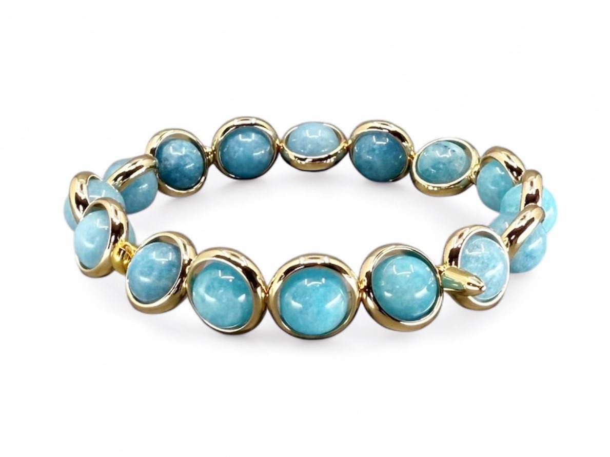 10 mm china blue jade stones are set in 14k gold-plate bezels and accented with spikes. Lifetime restringing. Can be custom sized at no additional charge.