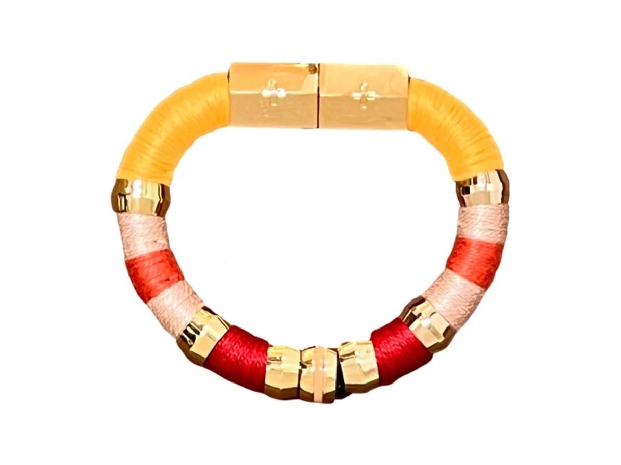 A wrap bracelet of nylon rope and pearl cotton thread, plus brass rings and a magnetic closure.