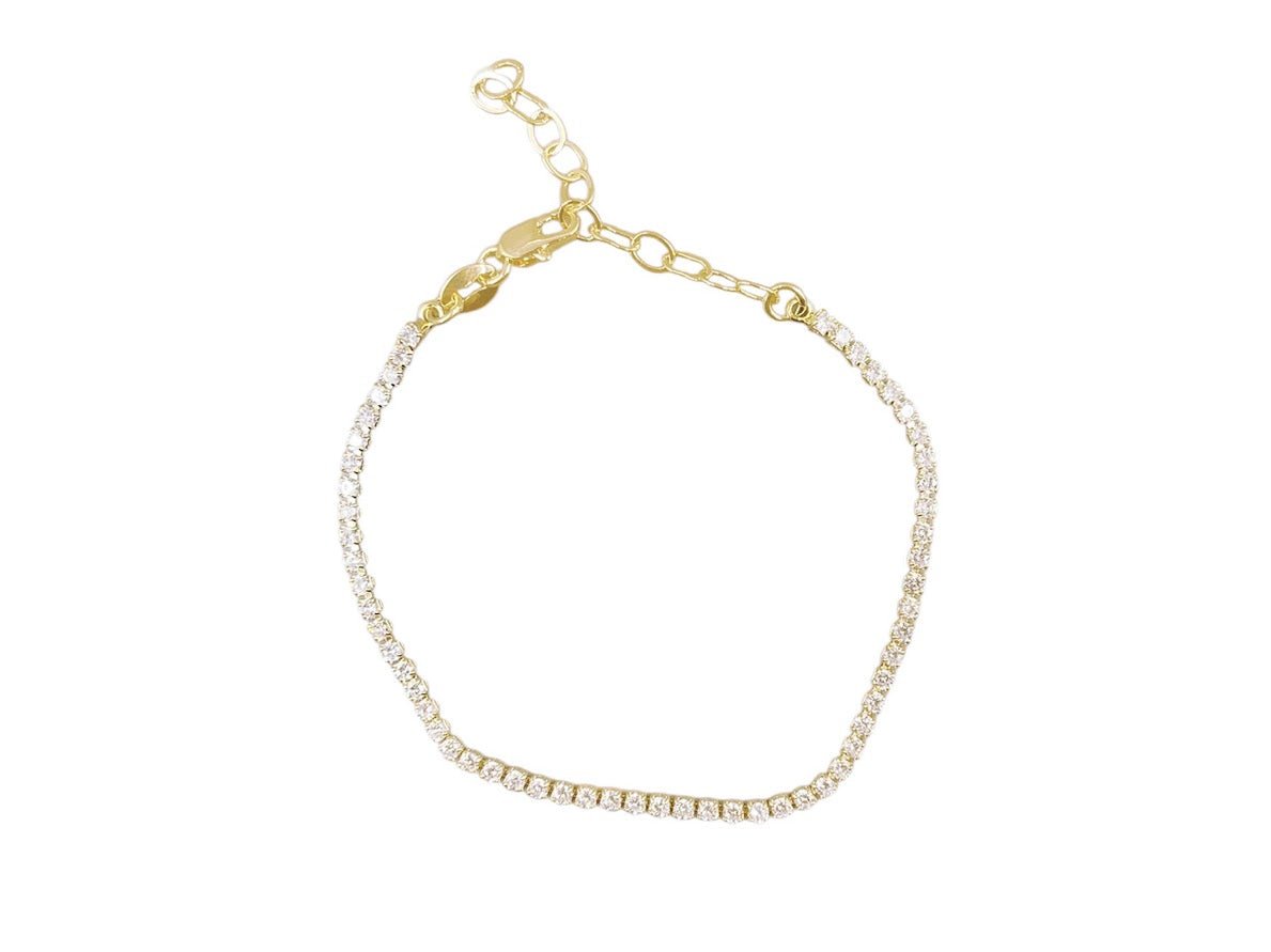 This 18k gold-filled tennis bracelet is detailed with 2mm cubic zirconia stones. 6.5 inches long plus a 1-inch extender. Perfect alone or stacked. Hypoallergenic.