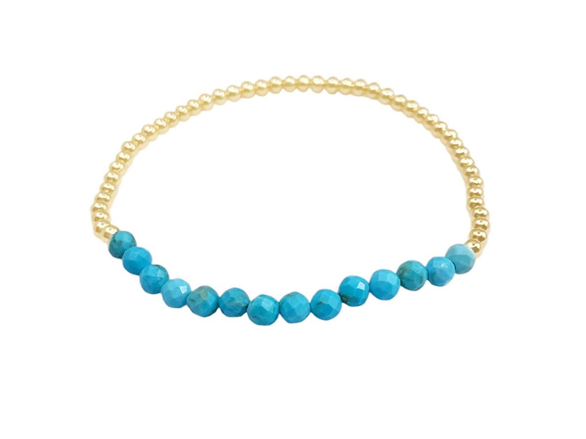 A bracelet of gold-plated beads with turquoise beads in front. Beads are strung on durable elastic to a length of 6.5 inches.
