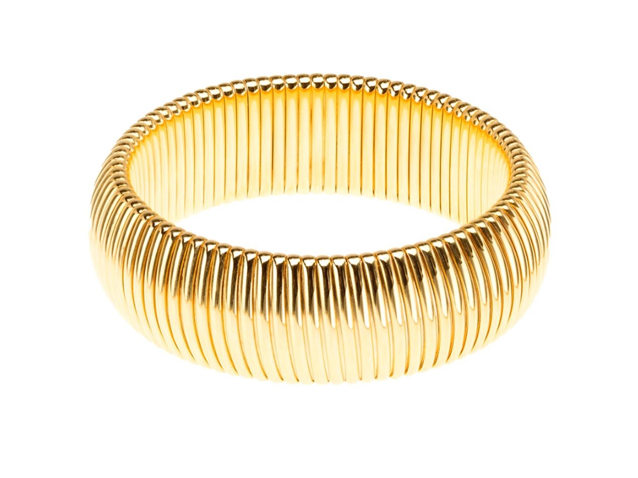 This 18k gold-plated ribbed cobra bangle that's .875 inch wide is a perfect addition to your wrist stack.