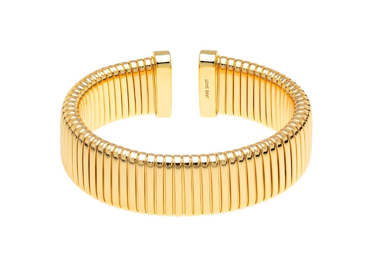 An 18k gold plate ribbed cobra cuff that's .75 inch wide. Comfortable and stylish, a must have. Adjustable size.