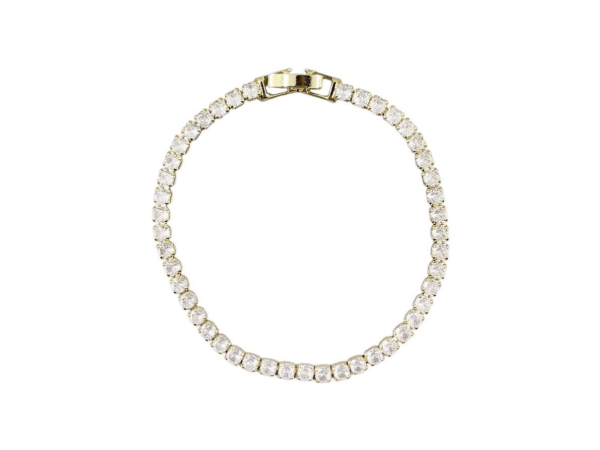 A gold-plated tennis bracelet with cubic zirconia stones and a latch clasp. 7 inches long.