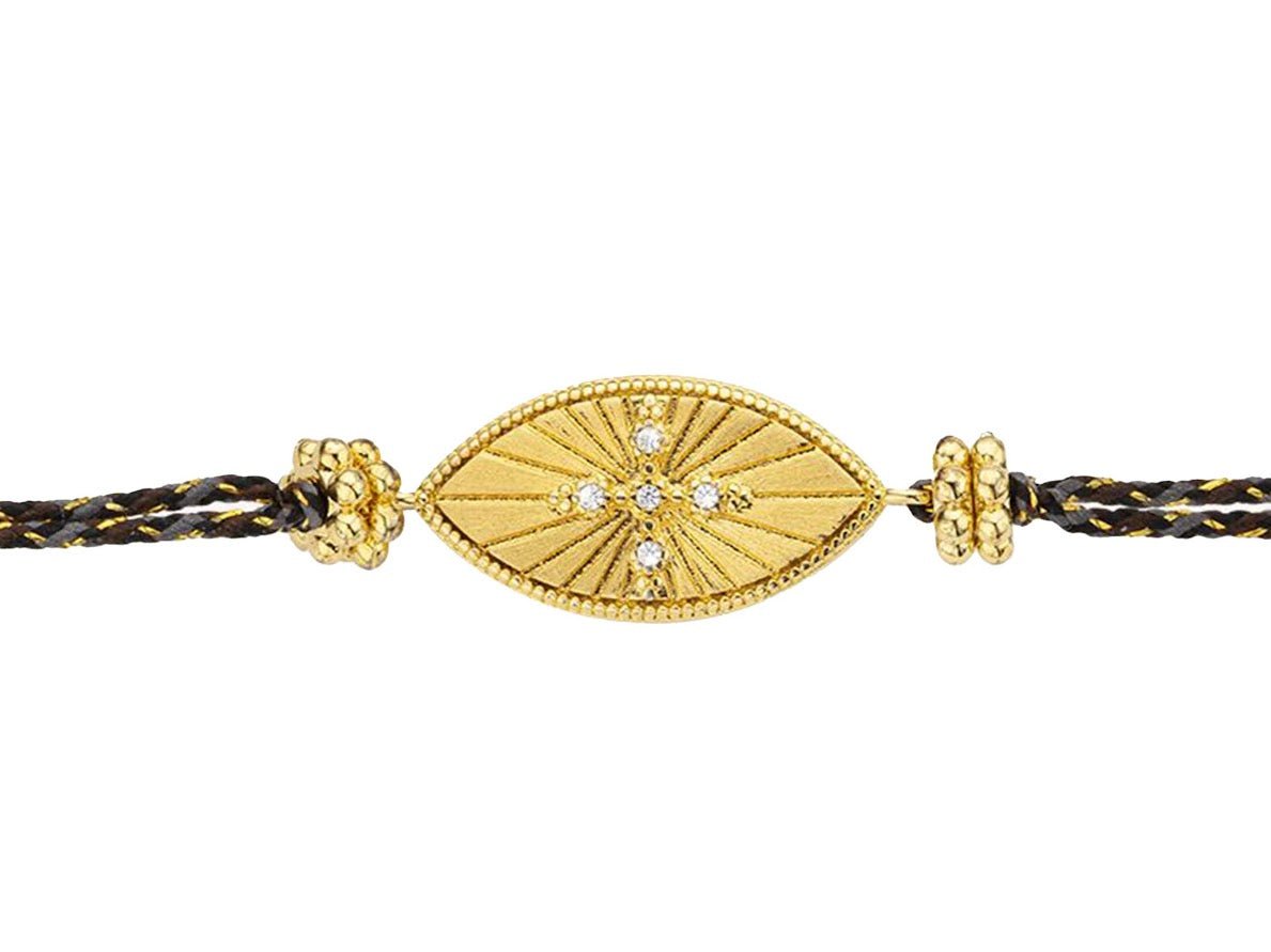From Belgium: Made of 18k gold-plated brass, plated again with 24k gold, this bracelet features an evil eye charm with five cubic zirconia stones on an adjustable black cord.