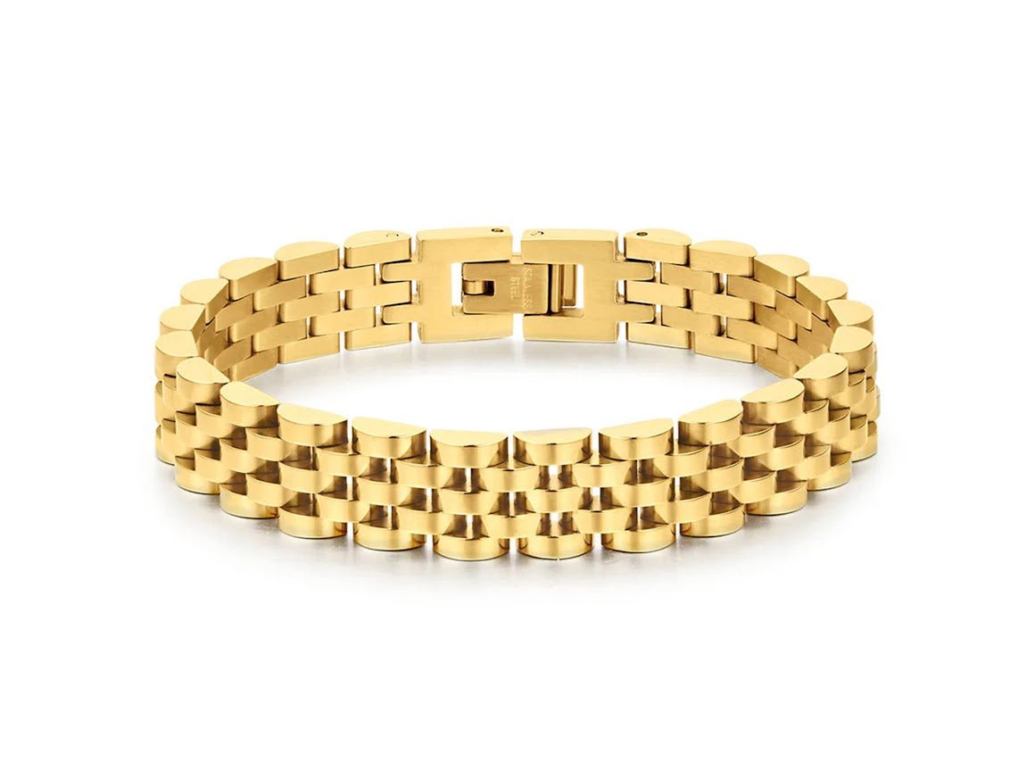 This gold-plated bracelet is made from stainless steel, is 10mm wide, and is 7 to 7.2 inches long. Nickel and cadmium free.