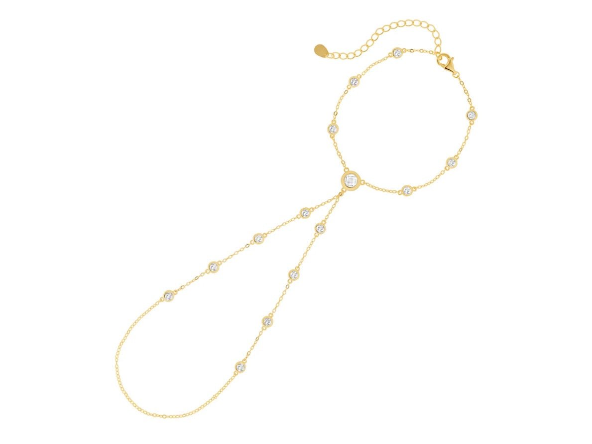 This 14k gold vermeil hand chain bracelet features one large and numerous small bezel-set cubic zirconia. Bracelet is adjustable from 6 to 8 inches.