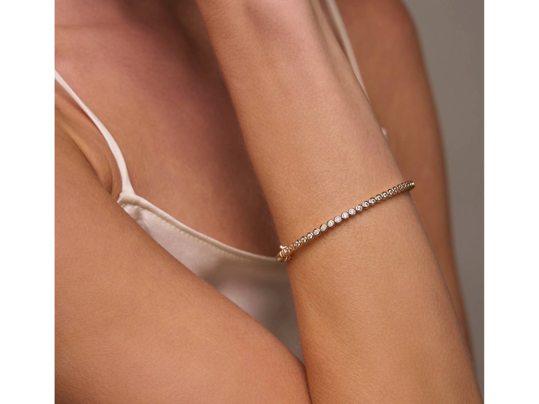 A 14k gold-plated bangle feataures round bezel-set 1mm cubic zircoina along the front. Refined and stackable. Bracelet fits 6 to 6.5 inch. Hinge closure with box latch.