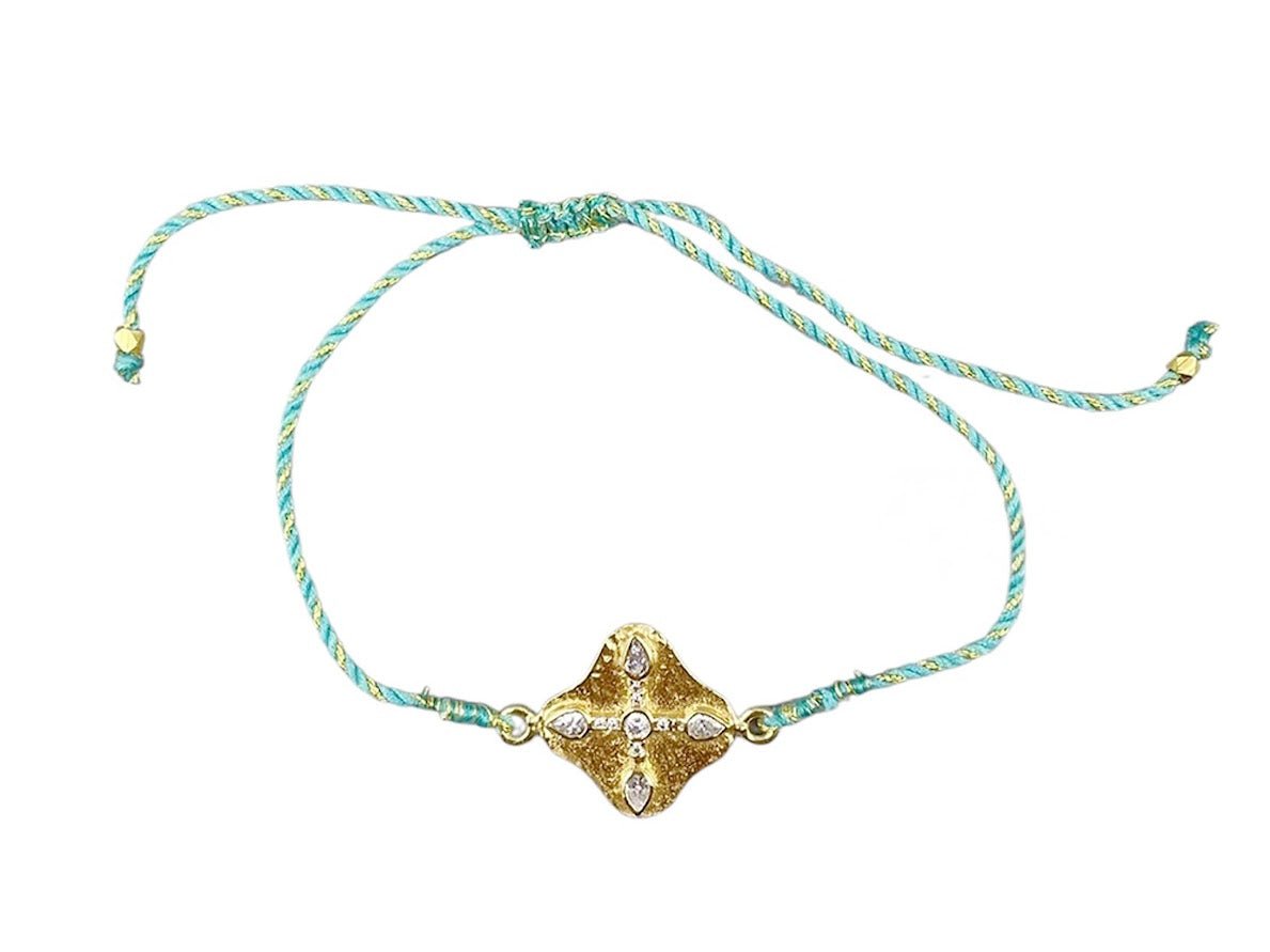 A gold-plated shield charm with zircon stones on a woven turquoise and gold adjustable cord. Made in France.