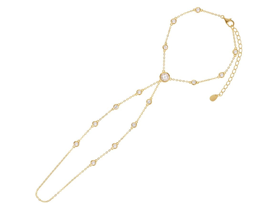 This 14k gold vermeil hand chain feature bezel-set cubic zirconia and measures 6 inches with a 2-inch extension, plus a 5-inch ring chain connector.