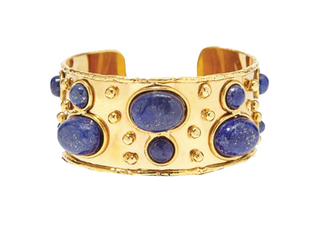 From Sylvia Toledano and made in France: Made of 22k gold over brass, this byzantine-style cuff features large oval and smaller round bezel-set lapis stones. Nickel free.