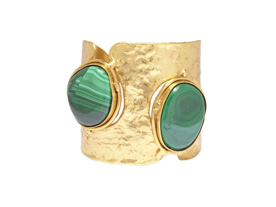 From Sylvia Toledano and made in France: Made of 22k gold over brass, this wide cuff features large oval bezel-set malachite stones. Nickel free.