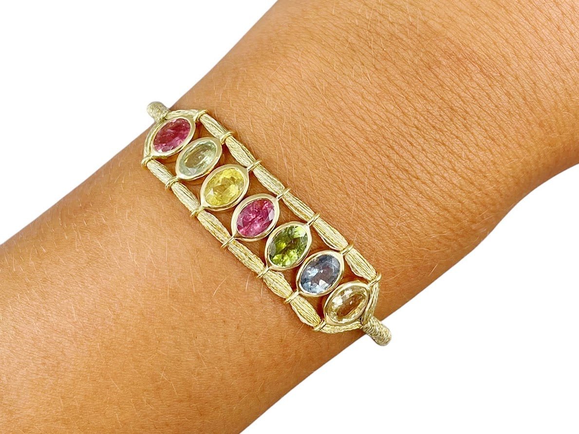A khaki thread bracelet set with seven multicolor tourmaline stones closes with a small lobster clasp. Adjustable.