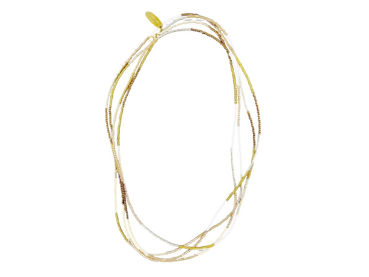 From Bunny Shapiro: A rap bracelet made of fine Japanese seed beads that can also be worn as a necklace or anklet with a sterling silver clasp. On the wrist, it wraps 12 times.