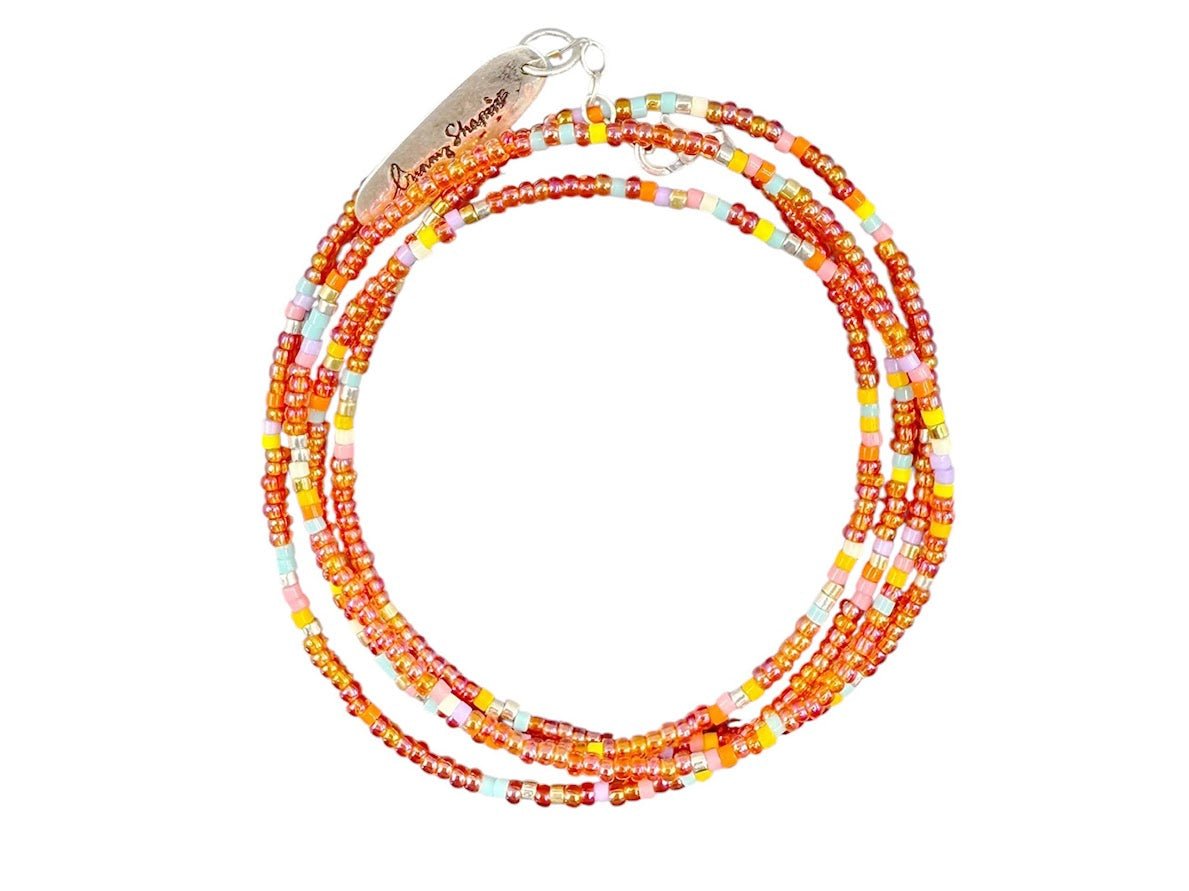 From Bunny Shapiro: A wrap bracelet made of fine Japanese seed beads with a sterling silver lobster claw and chain closure. Can also be worn as an anklet or necklace.