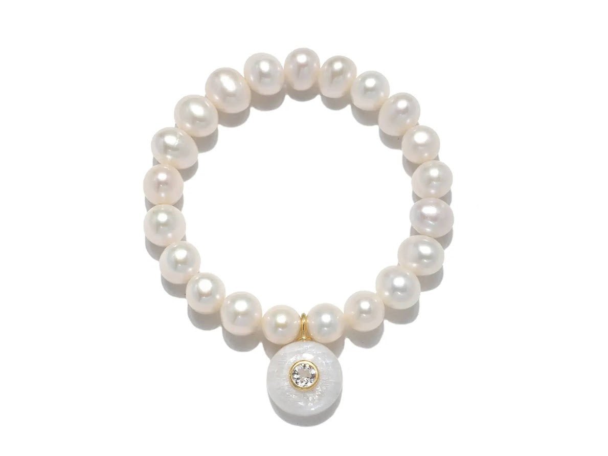 A freshwater pearl bracelet features a round charm of rainbow moonstone with a white topaz center storm. 14k gold vermeil components.