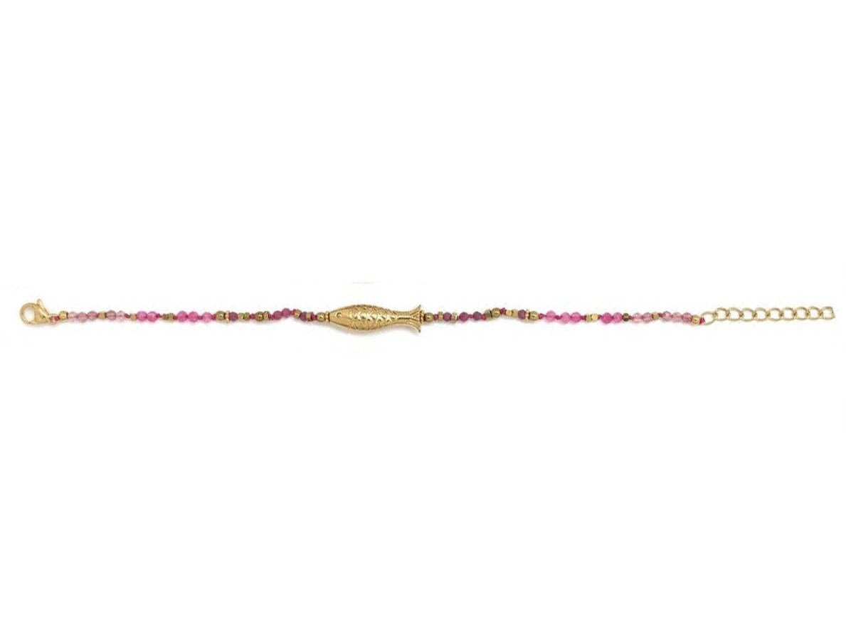 An adjustable pink bead bracelet features a gold-plated fish charm.