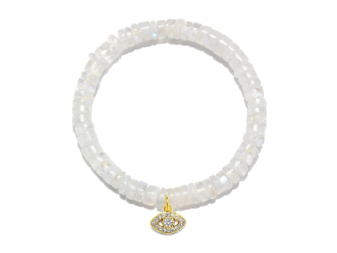 A stretch bracelet of rainbow moonstone offers a sparkling pave cubic zirconia evil eye.