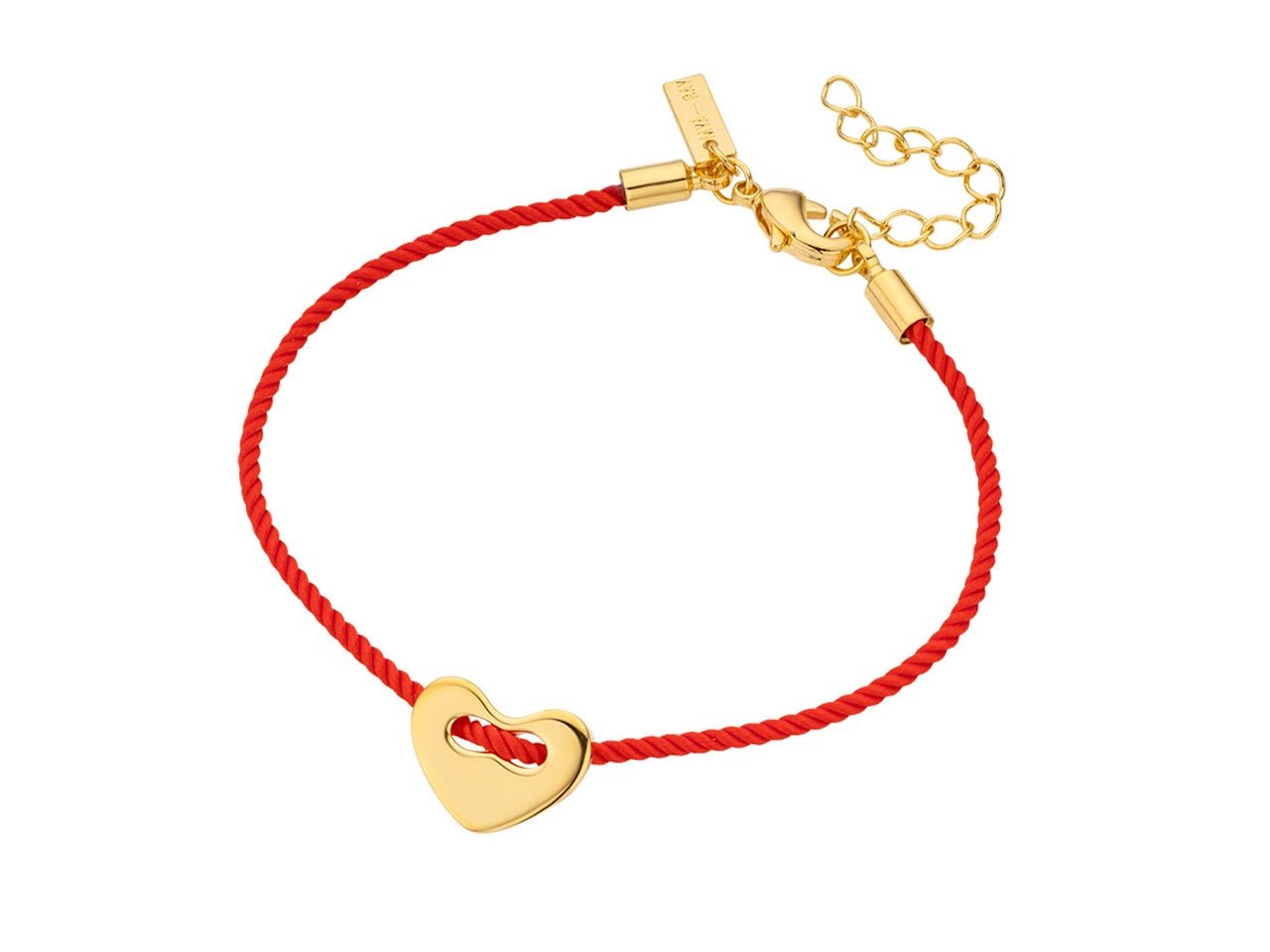 From Belgium: Made of 18k gold-plated brass, plated again with 24k gold, a tiny heart charm highlights a woven red adjustable cord.