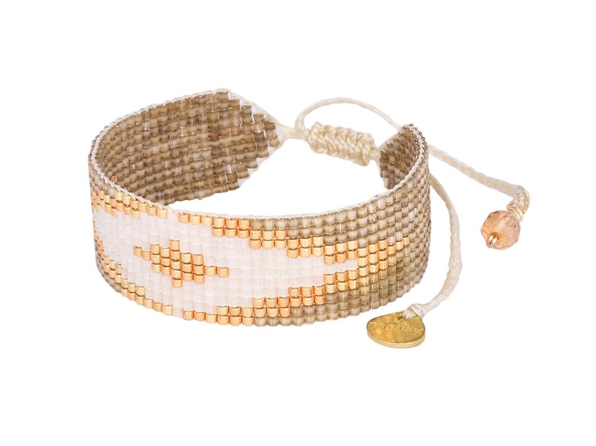 This adjustable-length bracelet is made of Japanese Miyuki beads, polyester thread, and cotton yarn, with a gold-plated logo and a faceted bead.