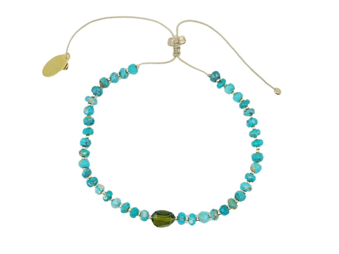 From France, an adjustable bracelet of turquoise beads with a faceted green tourmaline center stone and 18k gold-plated components. Nickel free.