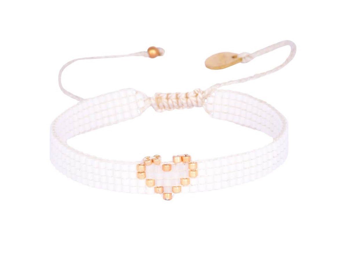 This adjustable-length bracelet is made of Japanese Miyuki beads, polyester thread, and cotton yarn, with a gold-plated logo and a faceted bead.