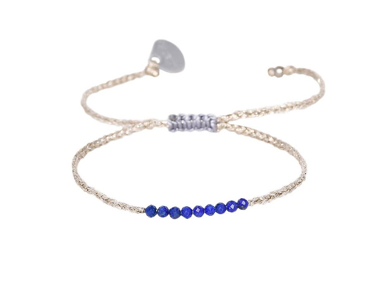 A gold woven adjustable bracelet with navy Japanese seed beads.