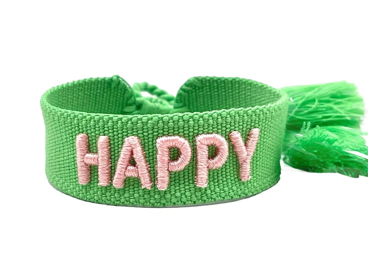 Green and Pink HAPPY Bracelet with Tassels