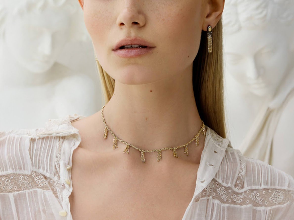 From France: Made of gold vermeil and beige silk yarn, this delicate bracelet features nine tiny fringe tassels and is adjustable from 34 to 37cm.