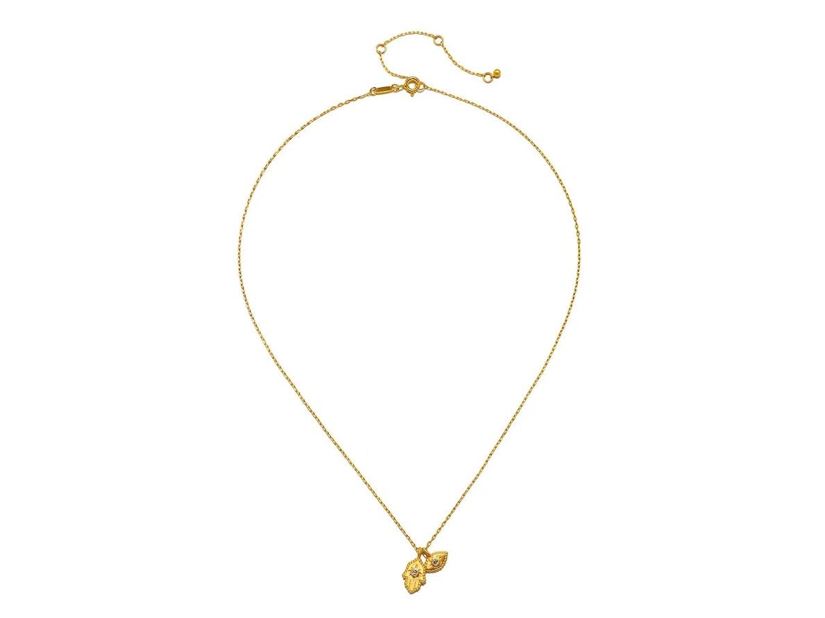 This 18k gold plated necklace features an 8mm by 13mm hamsa charm and an 11mm by 6.5mm evil eye charm, both with a 2mm white topaz center stone. Chain is adjustable from 18 to 21 inches.