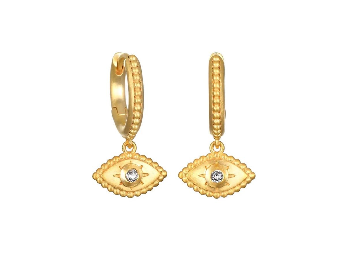 These 18k gold-plated huggie hoops, detailed with beading, feature 7mm by 11mm evil eye charms with 2mm white topaz center stones. Hoop closure is 18k gold vermeil. Hoop diameter is 14mm.