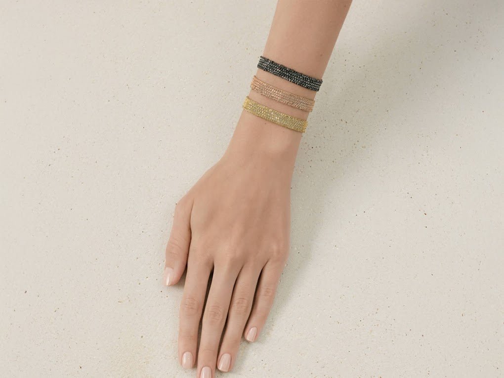 From France: A bracelet of woven gold vermeil chain with a gray silk cord that's adjustable with a sliding knot from 13.5 to 14.5 cm. 1cm wide.