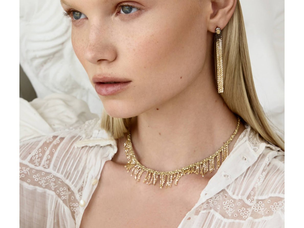 From France: Made of gold vermeil chain and beige silk yarn, this necklace features delicate fringe for movement and delight. Adjustable from 34cm to 37cm.