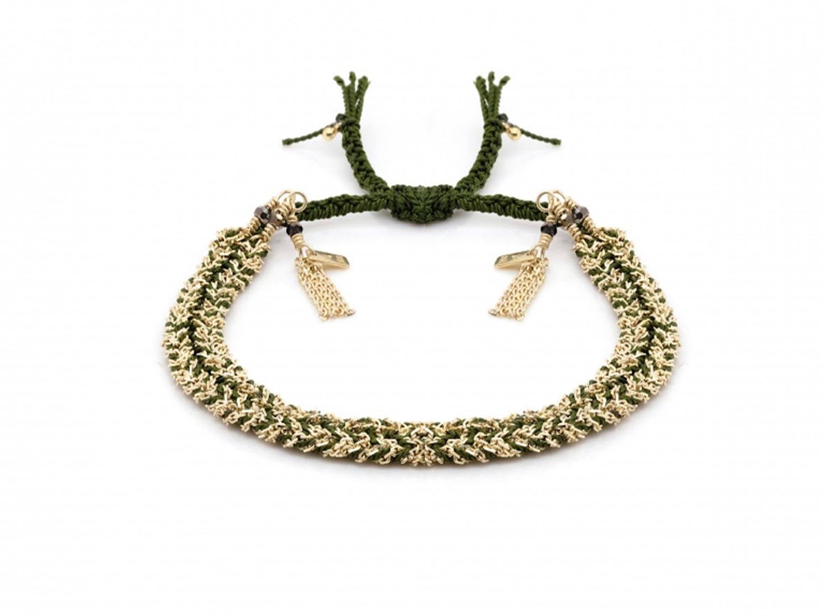 From France: An adjustable bracelet made of gold vermeil chain woven over braided green silk with tiny chain tassels.