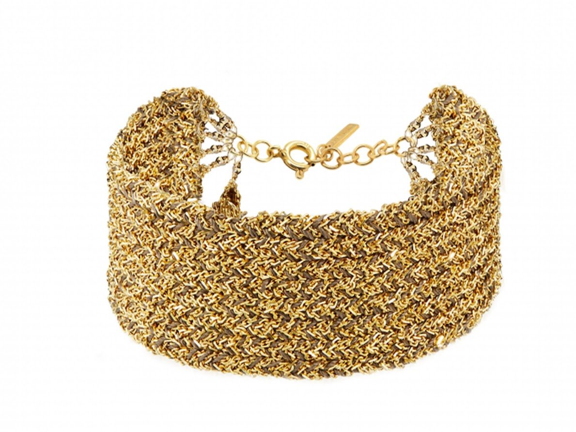 From France: An adjustable bracelet made of gold vermeil chain woven over braided gray silk.