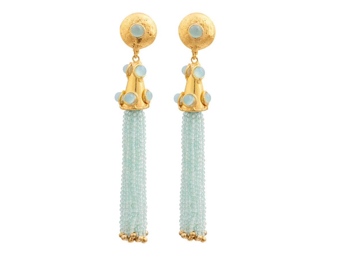 From Sylvia Toledano and made in France: Made of 22k gold over brass, these drop earrings feature chalcedony cabochons and strands of dangling chalcedony for movement. Nickel free.