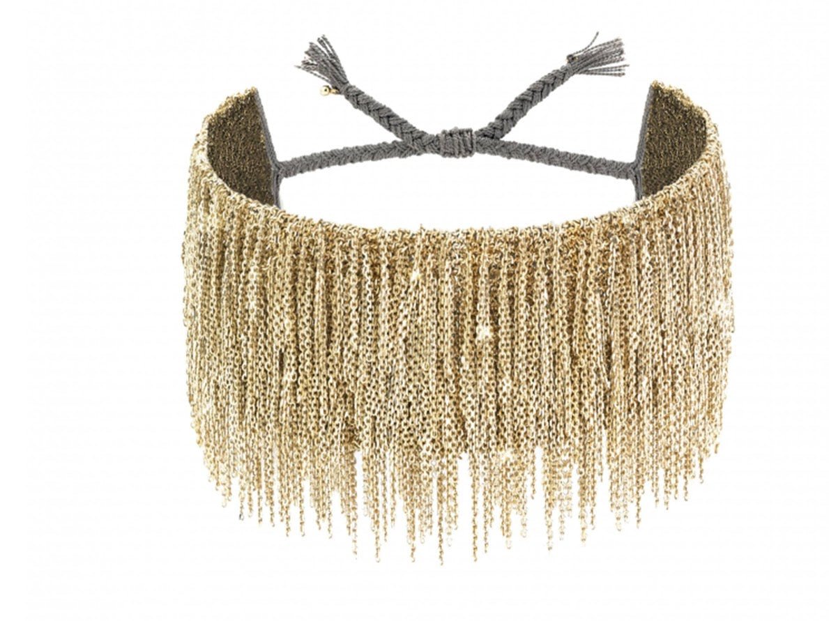 From France: A bracelet made of gold vermeil chain woven over gray silk with fringe. 3cm wide. A sliding knot allows a length from 13 to 23cm.