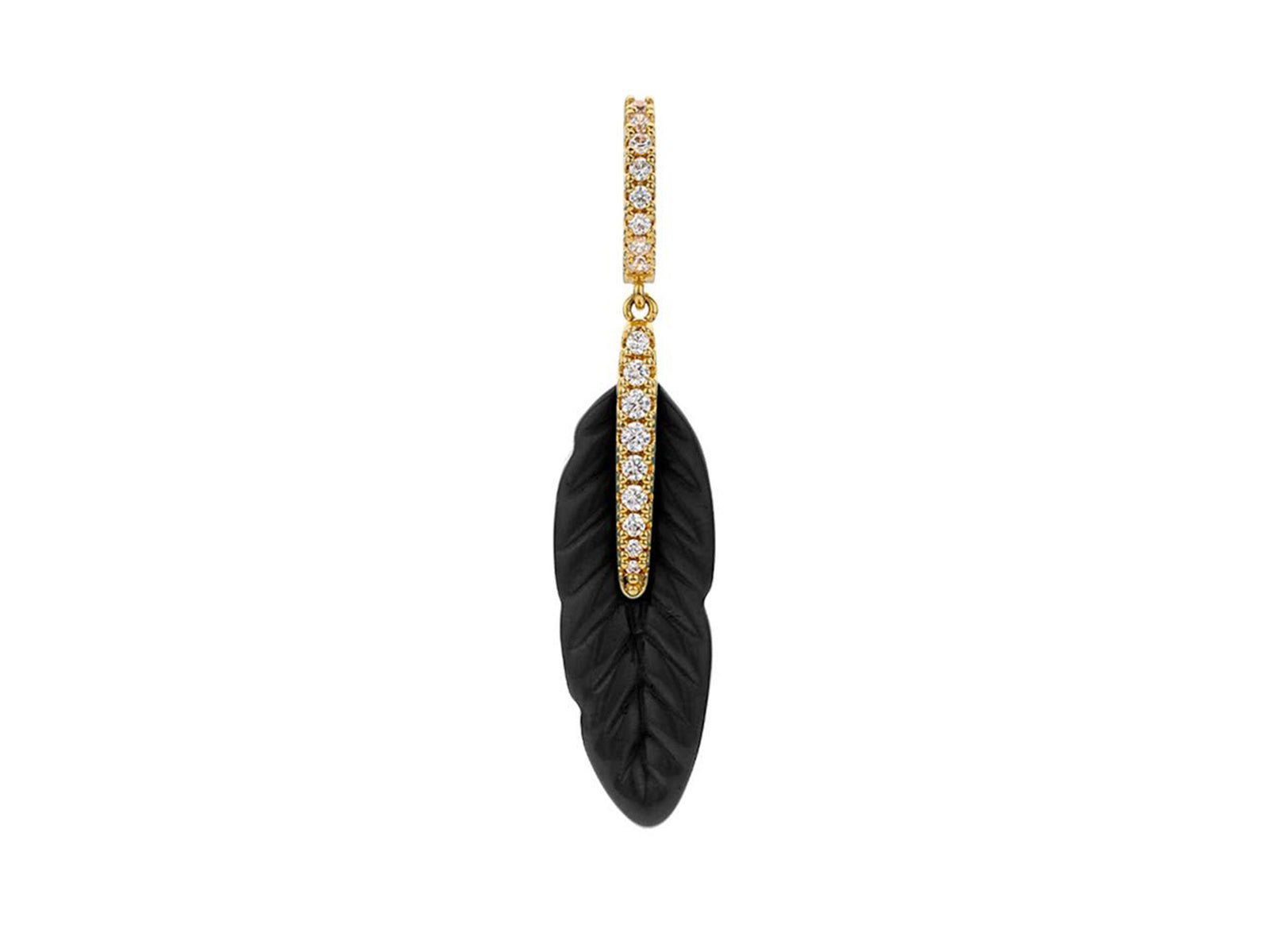 From Belgium: Made of 18k gold-plated brass, plated again with 24k gold, this huggie hoop, detailed with cubic zirconia, features a black feather drop.