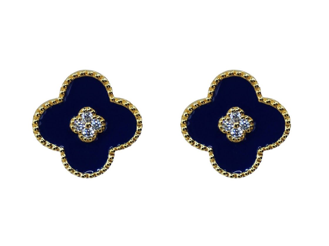 Blue Enamel Clover Stud Earrings with CZs