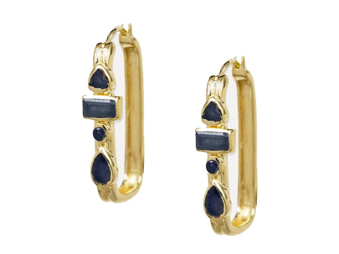 These 18k gold vermeil elongated rectangular hoops feature bezel-set multi-shaped blue sapphire accents. Outside dimensions are 14mm by 26mm. 1 inch long.